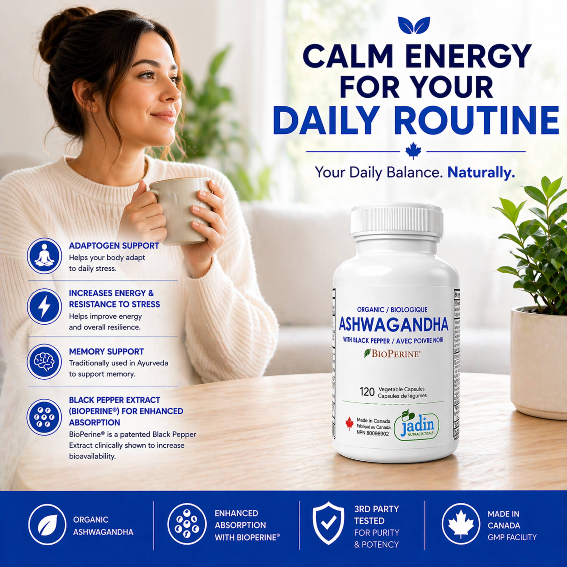 Organic ASHWAGANDHA + BLACK PEPPER (BioPerine) – 120 Vegetable Capsules